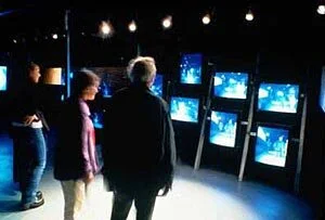 An undated review in German by Iris Dressler, translated by Babelfish, reports: "The prototype of the interactive installation 'It's About time' was already developed in 1988. The installation is based on a closed circuit video camera and monitor, which are manipulated, however, by an 'invisible' computer which connects them. The computer shows the picture of the viewer 'live', but temporally overstretched. From one's movement, the viewer seems as if rebuilt on the screen, permanently atomised and displaced. One dissolves in spirals, pixel, loops, and can, depending upon one's course of motion, for a short time completely disappear, as if one could from place to place 'beam oneself'. Inevitably one goes into the 'away there play', is equally dismayed as pleased when disappearing and reemerging. The installation, in the context of the exhibition is produced as a video projection."