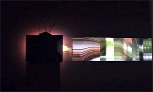 A slit-scan treatment of live television in an attractive installation format. The artists write: "The installation setup is as follows: A television is placed facing the wall, its flickering glow reflecting off the wall and its sound echoing in the space. Its broadcast signal is simultaneously sent to a computer, where customized software processes the broadcast in real time by collapsing every frame of the television image into a one pixel-wide slice. These slices are horizontally arranged in sequence and projected back onto the wall next to the television set, showing an abstracted history of the broadcast signal. Cinematic cuts are transformed into clear vertical sections. Zooms become visualized as curves. Commercials and music videos are seen as vibrant vertical patterns and hectic splashes of color, while News programs are calming studies of horizontal smears. Visitors are encouraged to switch channels with the remote control and explore the relationship between the broadcast, its sound and the projection."