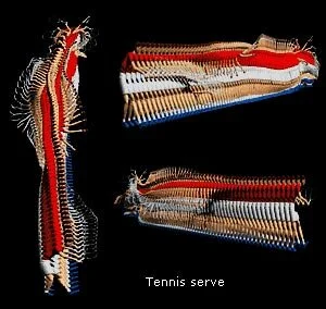 Hilpoltsteiner's project offers several unusual transformations of slit-scan (XYT) video volumes. These include visualizations which expose the cuting (editing) structure of the examined video; volumes which show the presense of a selected color over time; and visualizations which distort the cross-sectional area of the volume according to the amplitude of its accompanying audio track. The artist also uses transparency very cleverly; in the example pictured above, Hilpoltsteiner achieves an Edgerton-like visualization of a tennis serve by removing the background from the video frames before constructing the XYT volumes.