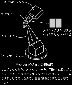 By rapidly moving the beam of light back and forth across the rotating sculpture, Iwai is able to image the entire 3D structure, and not just a thin cross-section of it. By changing the shape of the beam's trace from a straight line to a curvilinear path, Iwai selectively reveals the object at slightly different points in time. In this way he is able to create the remarkable illusion of a distorted and wriggling 3D sculpture.